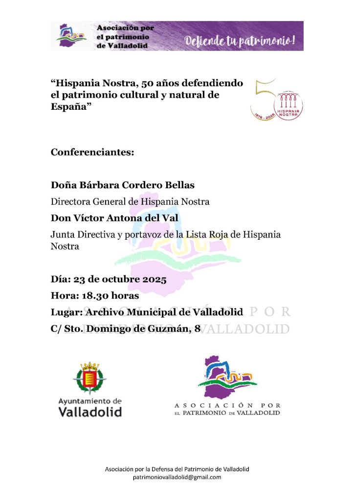 El próximo jueves 23 de octubre de 2025 a las 18.30 h en el Archivo Municipal de Valladolid , con entrada libre hasta completar el aforo , tendremos la oportunidad de conocer la Asociacion Hispania Nostra de la mano de Doña Bárbara Cordero Bellas , Directora General de Hispania Nostra y de Don Víctor Antona del Val , miembro de la junta directiva y portavoz de la Lista Roja de Hispania Nostra